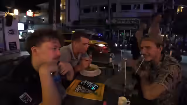 01:33:33Leon und Ronny sprechen über ihre Vorliebe für Thailand, insbesondere die Leute, das Wetter und das Essen. Allerdings erzählt Leon von einer Beschwerde eines Deutschen in einem Restaurant, der sie als zu laut empfand, obwohl andere Gäste dies nicht bestätigten. Sie erwähnen, dass Tobi wahrscheinlich im nächsten Jahr wieder dabei sein wird und dass die Leute von Svetlana begeistert sind, mit der sie später noch fahren werden. Sie wollen einen 7-Eleven besuchen, da Leon dort noch einen Live-Standort hat. Ronny erzählt, dass seine Verlobte bis vorgestern im Krankenhaus war, weil sie Wespen vergessen hatte. Sie loben den 7-Eleven, in dem man sitzen kann und wundern sich, Leon dort zu treffen, da dieser eigentlich die älteren Leute bevorzugt. Sie erklären, dass sie keine Hotels bekommen haben, da die Full Moon Party die Preise in die Höhe getrieben hat. Chico wird für die Buchung einer Unterkunft gelobt. Sie vergleichen die Full Moon Party mit dem Ballermann, nur mit anderer Musik, und erwähnen, dass es sich lohnt, sie einmal gesehen zu haben.