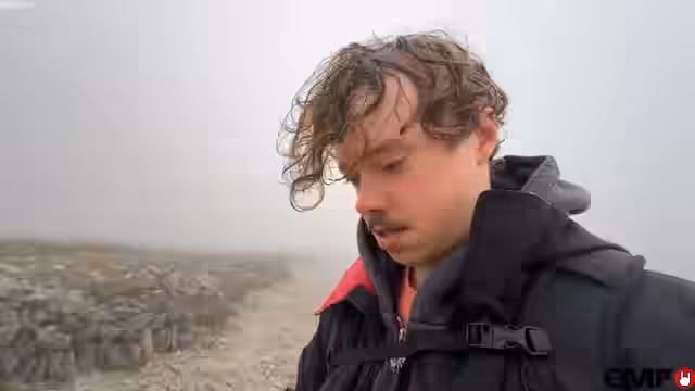 01:09:11Ronny Berger startet seine Besteigung des Croagh Patrick bei dichtem Nebel. Die Wolken liegen tief im Tal, während er den Aufstieg beginnt und die rauhe, neblige Atmosphäre beschreibt. Er erwähnt humorvoll den 'Heiligen Bären' in den Wolken und betont die epische Stimmung des unwegsamen Geländes, das sich ihm bietet.