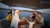 02:56:57Als das Boot in einer Bucht angekommen ist und die Bedingungen als sicher eingeschätzt werden, beginnen die Vorbereitungen für die Action: das Wrecking Ball. Nach den ersten erfolgreigen Sprüngen von Crewmitgliedern allein und zu zweit auf die Wassertrampoline, folgt der Höhepunkt: ein synchroner Sprung zu dritt. Die Aktion, die von hoher Aufregung und einer Mischung aus Angst und purem Spaß geprägt ist, wird als extrem gelungen und spaßig beschrieben und liefert zahlreiche potentiale Clip-Momente.
