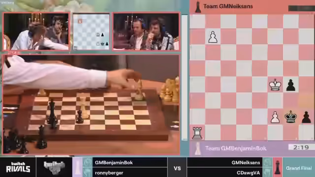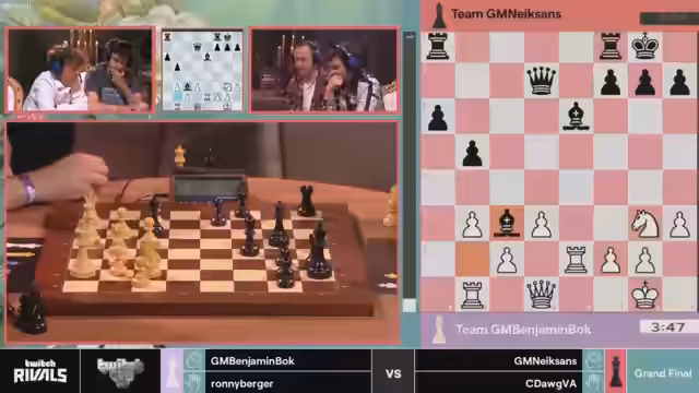 02:35:27Das Finale im Hand-and-Brain-Modus begann vielversprechend für das Team Bockberger mit einer typischen italienischen Eröffnung. Allerdings wendete sich das Blatt bereits in der frühen Phase des Spiels. Ein Fehler in der Eröffnungsphase führte zum Verlust eines Läufers, was Ronny Berger in eine schwächere Position brachte. Trotz dieses frühen Rückschlags blieb das Spiel jedoch offen und spannend, da beide Teams versuchten, taktisch die Oberhand zu gewinnen.