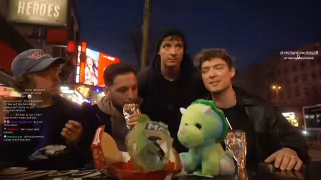 02:39:42Vor dem Auftritt gibt es für die Streamer und ihr Team noch eine Runde Pommes Frites zum Mittagessen auf der Reeperbahn. Sie unterhalten sich dabei über verschiedene Soßen, wobei Joppisoße als besonders empfohlen gilt. Während sie essen, organisieren sie noch schnell eine kleine Überraschung für die Jungs im Backstage-Bereich. Die Zeit wird knapp, also machen sie sich auf den Weg zur Venue. Ihr Plan ist, später im Publikum ein bisschen Crowd-Work zu machen, die Piñata zu schlagen und den Stream von einem Balkon aus fortzusetzen. Sie sind gespannt auf das Konzert und die Reaktion der Fans.