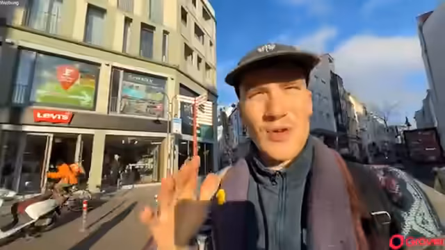01:00:49Während des Spaziergangs durch Köln stellt der Streamer einen vorbeikommenden Mann namens Adi zur Rede. Er versucht ihn dazu zu bewegen, vor die Kamera zu kommen und für einen kurzen Clip zu posieren. Nach anfänglicher Zögern lässt sich Adi auf ein 'Gage' von 5 Euro ein. Er gibt sich als 'Texas Man' und streamt auf Twitch. Nachdem der Geldbetrag übergeben wurde, verschwindet Adi jedoch abrupt wieder, was beim Streamer und im Chat für Verwirrung und Frust sorgt.