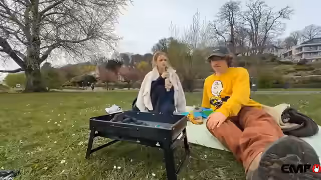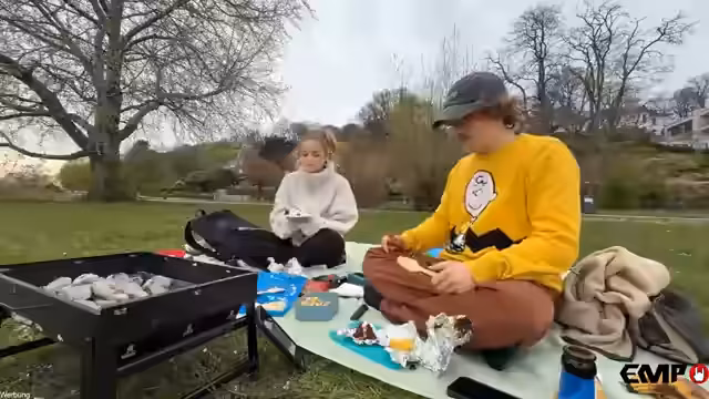 02:23:47Die Ankunft am Picknickspot markiert den Beginn des gemeinsamen Essens. Es wird eine professionelle Picknickdecke ausgebreitet und diverse Essensitems wie Bananen, Kuchen, Maiskolben, Sandwiches mit Grillgemüse und Nudelsalat präsentiert. Währenddessen tauschen die beiden ausführlich über ihre Allergien, insbesondere Pollen- und Hausstauballergien, und wie sie damit umgehen, was zu einem humorvollen Plauderstil über ihre sensiblen Nasen führt.