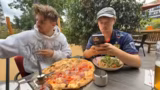 01:12:12Ein großer Teil des Streams findet in einem Restaurant statt. Die Streamer betrachten eine Monatskarte und entscheiden sich zum Teil spontan für Gerichte. Eine Pizza wird bestellt, wobei eine Hälfte vegetarisch sein soll. Der Streamer ist Vegetarier und ist neugierig auf veganes Hähnchen. Die Bestellung wird mit dem Kellner kommuniziert und die Streamer unterhalten sich über die Größe der Pizzen und die Idee, die andere Hälfte mit nach Hause zu nehmen.