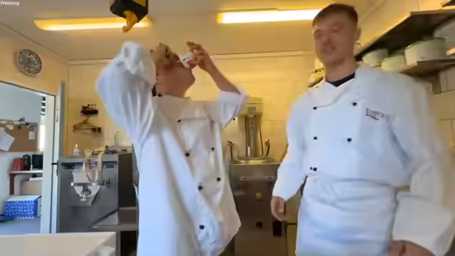 00:36:01Nachdem das Eis produziert ist, beginnt die Vorbereitung für den Verkauf. Das Team holt das fertige Eis aus der Kühlzelle und verteilt es in die Truhen des Eiswagens. Eine wichtige Aufgabe ist die interne Kennzeichnung der Sorten, da diese nicht von außen lesbar sind. Anschließend folgt eine gemeinsame Probierphase. Ronny und andere Teilnehmer versuchen, verschiedene Sorten wie Waldmeister, Engelblau und Banane blind zu erkennen, um ihre Geschmackskunde zu unter Beweis stellen.