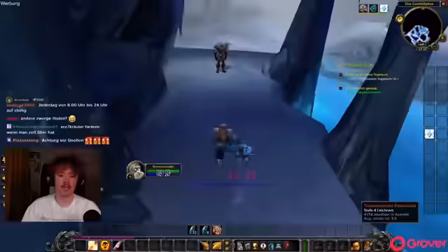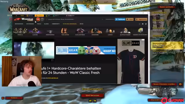 04:30:35Ronny startet WoW mit dem Ziel, einen Zwergenpriester für ein Community-Projekt zu spielen. Er plant ein Coaching mit dem erfahrenen Spieler Sieglinde. Diskussion über Server-Charaktere und das Problem von Namen, die während des Streamings sofort gesniped werden. Ronny empfiehlt, nach Charaktertod neue Namen zu wählen, statt gelöschte Charaktere neu zu erstellen.