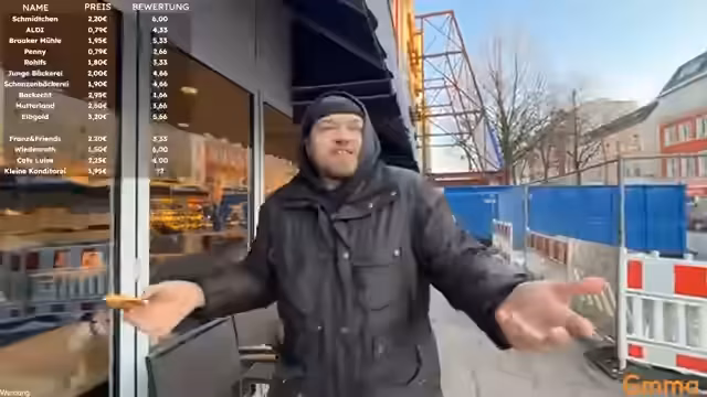 03:07:30Der Stream beendet das vielbeachtete Franzbrötchen-Ranking nach der Testung von über 14 verschiedenen Anbietern in Hamburg. Als klare Sieger ging die kleine Konditorei in der Osterstraße hervor, die mit einer Bewertung von 6,33 von 7 Punkten und einem Preis von 1,95 Euro den ersten Platz belegte. Auf den Plätzen zwei und folgten mit exakt 6 von 7 Punkten die Bäckerei Wiedenrot und Schmidtchen. Wiedenrot wurde dabei als Preis-Leistungs-Sieger hervorgehoben, da das dortige Franzbrötchen für nur 1,50 Euro erworben werden konnte.