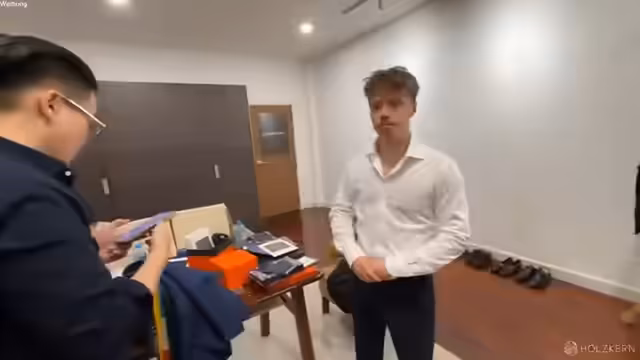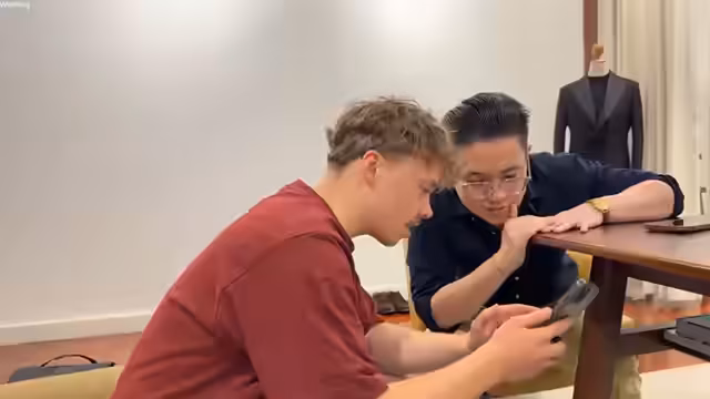 05:17:41Nach der Auswahl der Details beginnt der Vermessungsprozess für die Hose. Der Streamer probiert die erste Anprobe an, ist aber mit der Passform nicht zufrieden, da er sich zu eng anfühlt. Er erklärt, dass spezielle Hosenformen wie Hollywood-Trousers aufwändig in der Anfertigung sind, daher seltener angeboten werden. Um zukünftige Passprobleme zu vermeiden, wird ein拜访 eines lokalen Schneiders für Anpassungen empfohlen. Die erste Anprobe dient als wichtige Basis für die spätere Feinabstimmung.