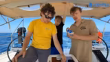 04:08:32Julian versucht sich am Stand-Up-Paddle-Board auf dem Wasser und wird dabei vom Boot gezogen. Er berichtet von den Herausforderungen, sein Gleichgewicht zu halten und die See zu erleben. Später wird ein Rettungsmanöver geübt, bei dem die Crew die Technik 'Man Over Bord' (M.O.B.) anwendet. Es wird diskutiert, wie man eine Person im Wasser effizient bergen kann und welche Körperspannung nötig ist, um selbst an Deck zu bleiben.
