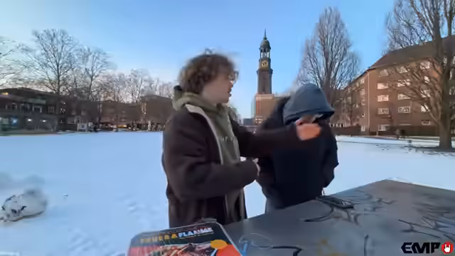 00:04:36Nach der Ankündigung, dass Jonsmann in Hamburg ist, stellt Ronny den konkreten Plan für den Tag vor. Sie werden eine vegane Fleischerei besuchen und dort Zutaten für Sandwiches kaufen. Das Highlight des Streams ist das Grillen im Schnee, wofür ein öffentlicher Grillautomat im Hafenviertel und ein Notfallgrill zur Verfügung stehen. Die Anreise zum ersten Ziel gestaltet sich jedoch etwas holprig und führt zu einer kleinen Verzögerung.