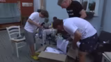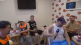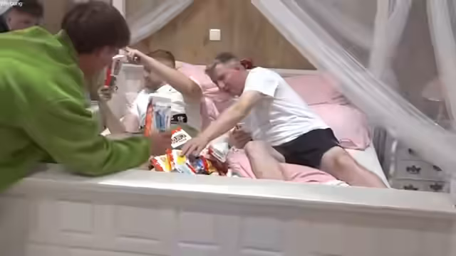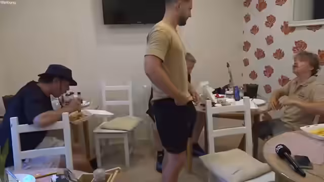 03:56:15Nach dem Essen findet eine spaßige Armwrestling-Challenge zwischen Kuba und Chef statt, wobei beide teilweise unbekleidet sind. Chef bemerkt, dass Kuba mit der linken Hand Schwierigkeiten hat. Die Herausforderung wird mit viel Humor und Provokation begleitet, wobei Chef Kuba auffordert, 'stark zu sein'. Schließlich stellt die Gruppe fest, dass Chef der Stärkere der beiden ist, was zu Lachen und teils absurden Vergleichen, etwa mit Reptilien, führt. Die Atmosphäre ist ausgelassen und ironisch.