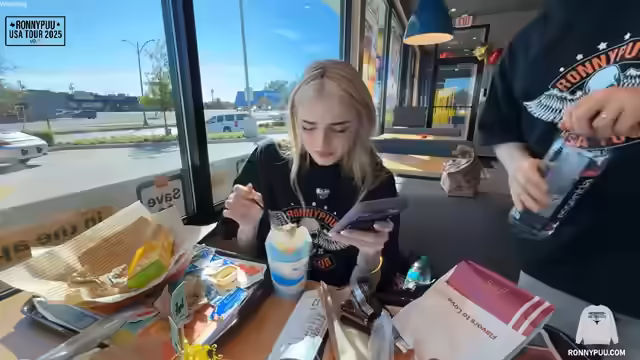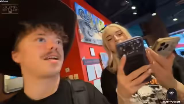 01:10:04Es wird überlegt, ob man im Stream Smoothies trinken und etwas essen soll. Die Streamerin und ihr Begleiter bestellen Smoothies mit verschiedenen Zusätzen wie Protein-Pulver. Es wird festgestellt, dass Kinderschokolade nicht deutsch ist, sondern von der italienischen Firma Ferrero stammt. Währenddessen läuft im Hintergrund die Datei für das Merch-Video. Nach dem Bezahlen und Erhalt der Quittung wird der Smoothie probiert und als nicht besonders lecker empfunden. Die Streamerin wundert sich über einen roten Finger und stellt fest, dass sie sich verbrannt hat. Abschließend wird über den Besuch der Shooting Range gesprochen, die erst um 11 Uhr öffnet, und überlegt, die Zeit in der Nähe zu verbringen, um zu sehen, was dort abgeht. Es wird kurz über eine Verhaftung in der Nähe gesprochen und die unterschiedliche Bewertung von Gaffern je nach Situation diskutiert.