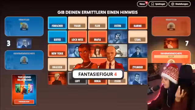 05:21:41Die Mitspi Merle errät die Wörter Kabine und Ninja für das rote Team, wobei es zu einem kritischen Fehler kommt. Sie wählt ein falsches Wort, was verheerende Folgen hat. Die genaue Ursache ist nicht klar, aber die Konsequenzen für das Team sind katastrophal. Währenddessen versucht der Spymaster Gambo, die restlichen Wörter wie Figur und Mafia zu erklären, was zu weiteren Diskussionen über mögliche Verbindungen führt, wie zum Beispiel Archäologe, der Knochen findet, und Fantasyfiguren.