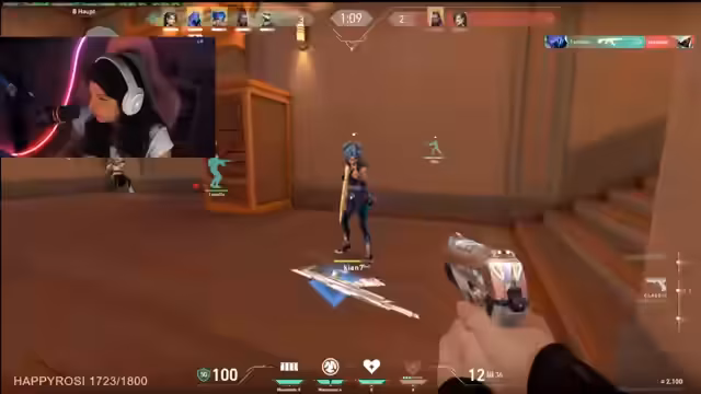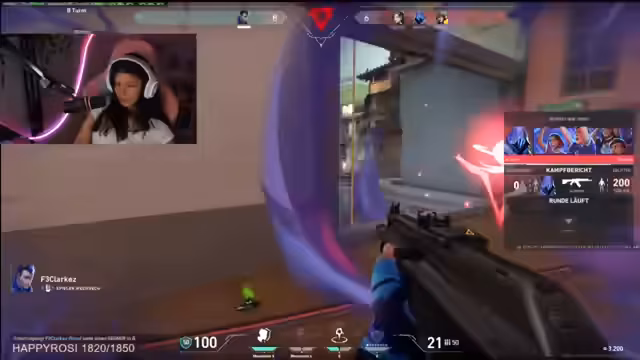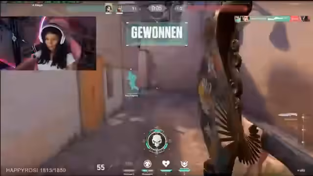 06:55:44Der Stream konzentriert sich auf intensives Valorant-Spielgeschehen, wobei die Streamerin überwiegend als Angreifer agiert und in zahlreiche knappe Situationen gerät. Ihre Kommentare reichen von Gelächter über „Der Kill war geil“ bis zu Frustration, wenn sie eliminiert wird. Sie bezieht sich oft auf ihre Mitspieler und deren Aktionen, betont die Wichtigkeit von Teamwork und rückt häufig in die Rolle der letzten überlebenden Verbündeten.