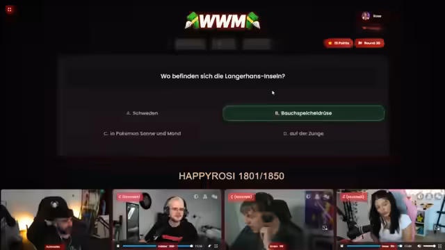00:39:03Das eigentliche Quiz beginnt mit einigen einfachen Wissensfragen. Die Spieler nutzen ihre Joker strategisch, wobei einer die Risiken des Risk-Jokers nutzt und sich doppelte Punkte sichert. Das Verlauf des Spiels wird live verfolgt und bei technischen Problemen, wie dem Einfrieren der Anzeige, wird der Stream kurz unterbrochen, um die Seite neu zu laden und die Spielbedingungen für alle wiederherzustellen.