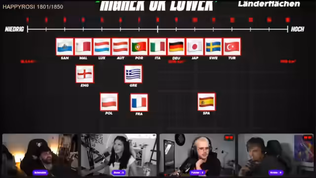 01:29:28Der Stream beginnt mit einem Quiz, bei dem jeder Teilnehmer drei Leben hat. Die erste Runde bezieht sich auf die Sub-Zahlen der Streamer. Teilnehmer müssen einschätzen, wer mehr Subs hat, und treffe dabei richtige oder falsche Aussagen. Es gibt einen technischen Zwischenfall, bei dem die Anzeige der Herzen nicht aktualisiert wird, was zu Verwirrung führt.