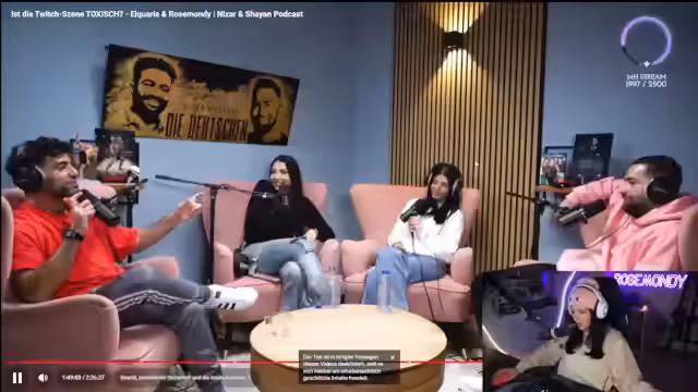 04:16:54Die Streamerin erklärt ihren vermeintlichen Sprachfehler „9“ (Noin), der durch eine lustige Situation mit Rohat entstanden ist und sich in ihren Wortschatz eingebrannt hat. Sie bittet die Zuschauer, ihre Meinung zu einem Podcast zu äußern, in dem sie aufgetreten ist, und kritisiert toxische Kommentare. Sie verteidigt ihre Argumente im Podcast, insbesondere ihre Sichtweise auf Frauen und Männer in der Gesellschaft. Währenddessen trifft sie im Spiel auf einen Freund, der vom Fußball kommt und ihr Gebäude bewundert. Sie zeigt ihm ihre „Hundezuchtstation“, die humorvoll als „Inzuchtstation“ bezeichnet wird, und sie entscheiden sich, einen Hund namens Jeremy Pascal zu adoptieren. Die Situation wird durch lustige Dialoge und Missverständnisse rund um die Hunde und deren Namen aufgelockert.