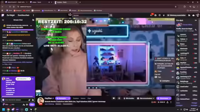 12:49:05Es gibt eine bedeutende Kooperationsankündigung mit dem Projekt FitnaCraft, in dem die Streamerin als Teilnehmerin aufgenommen wird. Dies begrüßt sie sehr, da sie bereits im Vorjahr am Projekt teilgenommen hatte. Des Weiteren kommt es zu großen Raids von anderen Streamern wie Uro Talks, was die Streamerin sehr dankbar zur Kenntnis nimmt und sich über die große Unterstützung freut.