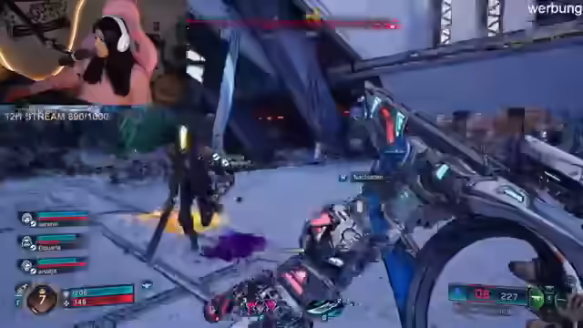 00:32:07Die Gruppe diskutiert über Reisemöglichkeiten im Spiel und versucht, einen Ort einzunehmen. Es kommt zu Kämpfen mit Gegnern, die immer wieder respawnen. Es wird über das Farmen von Leveln gesprochen. Die Gruppe versucht, in ein Gebäude hochzukommen, um Waffen zu verkaufen. Es gibt Diskussionen darüber, ob man beim Sterben seine Sachen verliert. Die Gruppe fliegt über die Karte und versucht, einen bestimmten Punkt zu erreichen. Es gibt Schwierigkeiten beim Fliegen und Klettern. Ein Spieler holt kurz sein Essen. Die Gruppe diskutiert über Waffen und Skillpunkte. Ein Spieler holt sich einen Gefährten und ist begeistert. Es wird über die Steuerung des Gefährten gesprochen. Die Gruppe kämpft gegen weitere Gegner und rettet kleine Bisons. Es wird über die Grafik des Spiels und die Musik gesprochen. Die Gruppe entdeckt grüne Glitchdinger, die Munition und Geld spawnen. Es wird über die Ulti-Fähigkeiten der Charaktere gesprochen.