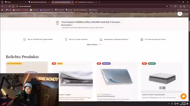 01:10:05Im Rahmen einer Partnerschaft stellt der Streamer Emma Matratzen vor und bietet mit dem Code 'Rosemondi' 5% Rabatt auf Bestellungen. Es folgt ein detailliertes Unboxing der Matratze und des dazugehörigen Kissens, bei dem die Eigenschaften wie Memory-Schaum, Ergonomie und Luftzirkulationstechnologie (Ergo-Cell-Schicht) betont werden. Die Vorteile für Rücken- und Nackengesundheit werden hervorgehoben und der Nutzen täglicher Schlafunterstützung erklärt.