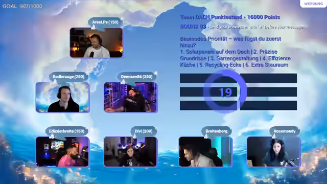 05:03:20Ein neues Quiz-Spiel wird vorgestellt, bei dem die Teilnehmenden Fragen beantworten müssen, wobei die Antworten durch die Aktivität in den Chats der Zuschauer bestimmt werden. Die am häufigsten gespammte Antwort in den Chats gibt die meisten Punkte für den jeweiligen Streamer. Es wird betont, dass die Teilnehmenden ihre Chats kennen und einschätzen müssen, welche Antworten am wahrscheinlichsten sind. Das System misst die Antworten aus allen sieben Chats, um Cheating zu verhindern. Es wird ein Beispiel gegeben, um das Prinzip zu verdeutlichen. Die Punkte, die durch die richtigen Antworten erzielt werden, werden in Subs umgewandelt. Die erste Runde dient als Testlauf, um das System zu verstehen. Es wird erklärt, dass jeder Teilnehmende einmal den Vorteil hat, als Erster antworten zu dürfen. Das Ziel ist es, die Top-Antworten zu finden, um am Ende die meisten Punkte zu sammeln.