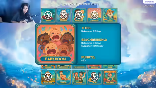 04:13:00Die Digsbums Challenge (Multitalent Challenge) wurde abgeschlossen. Es wird überlegt, was noch fehlt, nämlich Küsse, Reichtum und das zweite Baby. Die Kussjagd wird erfolgreich abgeschlossen, indem drei verschiedene Charaktere geküsst werden. Ein Screenshot davon soll im Discord geteilt werden, um das nächste Giveaway zu starten. Es wird diskutiert, wie man das zweite Kind bekommen kann, nämlich durch Heirat und anschließendes Warten im Bett. Es wird erklärt, wie man das Karma-Symbol im Gesprächsmenü nutzt, um das Karma zu maximieren und eine SMS von Gott zu erhalten. Ein neues Giveaway wird gestartet, bei dem mehrere Headsets verlost werden. Es wird auf den Link von Raft verwiesen, um teilzunehmen. Die Teilnehmer haben bis 19:45 Uhr Zeit, an den Challenges teilzunehmen. Es wird überlegt, ob es einfacher ist, als Frau einen Mann zu verführen, um schwanger zu werden. Die Möglichkeit, die eigene Schwangerschaft zu beschleunigen, wird in Betracht gezogen. Es wird vermutet, dass das französische Team schneller war, weil sie mehr Frauen im Team hatten, die sich gleichzeitig schwängern lassen konnten.