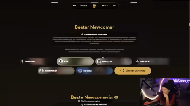00:17:14Die Streamerin thematisiert die Streaming Awards, bei denen heute der letzte Tag zum Abstimmen für die Kategorie 'Newcomerin des Jahres' ist. Sie bedauert, dass sie aufgrund ihrer Abwesenheit in Kroatien nicht ausreichend Werbung dafür machen konnte. Sie bittet ihre Zuschauer, ehrlich zu sein, wer bereits abgestimmt hat und für wen. Rosemundy manifestiert, dass alle, die für sie gestimmt haben, Glück im Leben, ihren Traumpartner finden und finanziellen Erfolg haben werden. Sie stellt klar, dass der Begriff 'Newcomerin' ihrer Meinung nach nicht ganz passend ist, da sie bereits seit 2020 streamt und eher 'Rising Star' zutreffen würde, aber sie freut sich über die Nominierung und den möglichen Award.