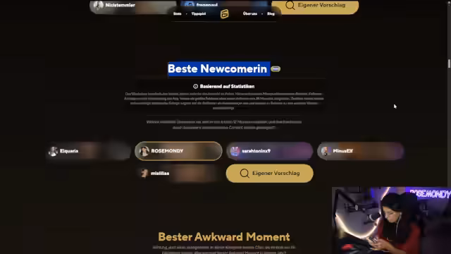 02:52:41Die Streamerin fordert die Zuschauer auf, ihre Stimme für den besten musikalischen Akt abzugeben. Sie tendiert dazu, Helgen zu wählen, da sie ihre Stimme als sehr schön und underrated empfindet und vermutet, dass Helgen ohne Filter singt. Während der Abstimmung kommt es erneut zu einem kritischen Kommentar eines Zuschauers, der fragt, warum sie in ihrer Auswahl nie Männer berücksichtige. Die Streamerin reagiert empört und zählt mehrere männliche Streamer auf, die in den Kategorien nominiert sind, und stellt klar, dass sie bisher sogar noch keine Frau gewählt hat. Sie kritisiert die Engstirnigkeit und Vorurteile des Zuschauers, der offenbar davon ausgeht, dass sie Männer diskriminiert. Sie entscheidet sich schließlich für Helgen, um sie zu motivieren und ihre musikalische Karriere zu fördern, und betont, dass sie beide, Helgen und Ifras, sehr gut findet.