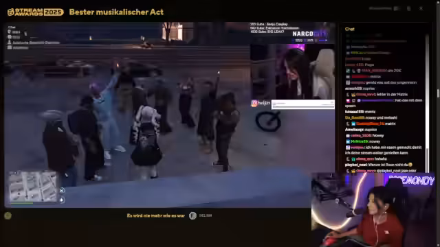 07:13:10Es wird die Aussicht auf Minas Tirith von der aktuellen Position aus thematisiert, wobei Rosemondy bemerkt, dass die Sonne zur Mittagszeit eine Sonnenfinsternis verursacht und Schatten wirft. Der Ort wird als 'süß' und 'schön riechend' beschrieben. Die Idee, in einem leeren Raum eine Karaoke-Bar einzurichten, wird aufgegriffen. Dabei wird die Sorge geäußert, dass Maser dort singen könnte, was zu einer Erinnerung an einen früheren Gesangsauftritt bei 'Mand im Mond' führt, der als 'krank' und 'what the fuck' beschrieben wird. Die Vorfreude auf die Stream Awards und ein Wiedersehen dort wird geäußert. Es wird das Gefühl geteilt, dass die Community in diesem Jahr enger zusammengerückt ist, insbesondere durch 'Kraftattack', was als positiv empfunden wird, da es die früheren 'extremen Bubbles' aufgelöst hat und die Atmosphäre weniger 'gespalten und kalt' ist. Auch die Mädchen-Community sei enger zusammengerückt.