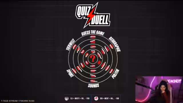 05:57:37Die Teilnehmer sind mitten in einem intensiven Quizkampf und konkurrieren um Punkte in verschiedenen Kategorien. Es gibt Auseinandersetzungen über falsche Antworten und die Spielstrategie, wobei einige Teilnehmer vorschnell drücken und sich gegenseitig tadeln. Das Team versucht, Minuspunkte zu vermeiden und gezielt Punkte in Kategorien wie Politik, Kennzeichen und Wissen zu sammeln.