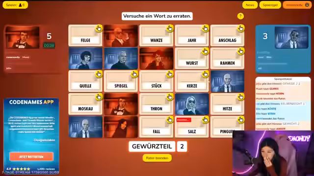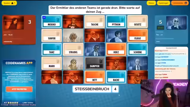 06:53:53Die Codenames-Runde läuft weiter, aber es gibt technische Schwierigkeiten und Missverständnisse. Ein Spieler ist stumm geschaltet und kann nicht kommunizieren, was den Prozess verlangsamt. Es gibt Diskussionen über die korrekten Wortverbindungen und die Teilnehmer geben sich gegenseitige Tipp, um das Spiel voranzutreiben.