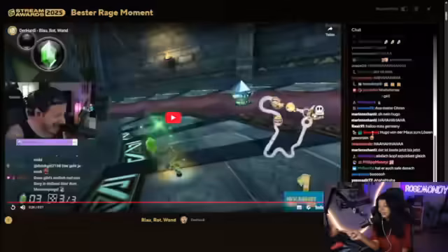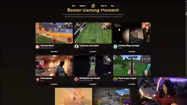 09:40:17Die Diskussion dreht sich um die 'besten IRL-Streams des Jahres', wobei 'Datenschutzpapier' als ein besonders lustiger und 'Germany in a nutshell'-Moment hervorgehoben wird. Es wird kurz überprüft, ob andere Streamer wie Rohat oder Sam bereits live sind. Anschließend wird auf eine Nominierung für den 'Newcomerin des Jahres'-Award eingegangen, für die der Streamer in seinem Discord geworben hatte. Es werden verschiedene Gaming-Clips gezeigt, darunter ein Rocket League-Match, in dem der Freund von Maluna spielt und Eigentore schießt, was für Verwirrung und Gelächter sorgt. Die Mods werden gebeten, einen Link zum Voting für 'Rose, Newcomerin des Jahres' zu entpinnen, da nur noch acht Stunden Zeit bleiben. Weitere Gaming-Momente werden kommentiert, darunter ein Clip, in dem ein Endboss ohne Schaden besiegt wird, und ein Geo-Guessler-Moment, in dem die Streamerin die Stadt Cape Town in Südafrika errät, was als 'crazy' bezeichnet wird.