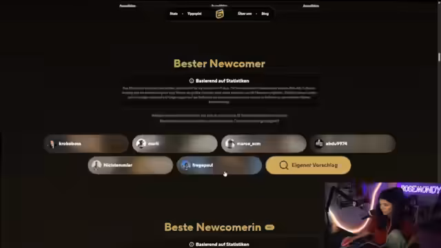 12:40:09Die Streamerin ruft ihre Zuschauer dazu auf, für sie beim Newcomer of the Year Award abzustimmen. Sie ist dieses Jahr nominiert und würde sich sehr über jede Stimme freuen. Es wird erwähnt, dass ein angepinnter Link im Chat zur Abstimmung führt, wo man für die Kategorie 'Beste Newcomerin' voten kann. Die Abstimmung ist wichtig, da nur noch wenige Stunden verbleiben. Zudem bittet sie um Unterstützung für den 'Besten Trollmoment', den sie ebenfalls gerne gewinnen möchte. Dies zeigt die aktive Teilnahme der Streamerin an Community-Events und ihren Wunsch nach Anerkennung für ihre Arbeit.