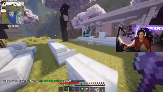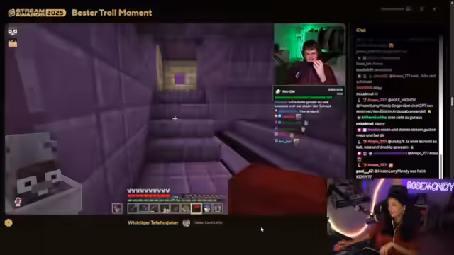 08:02:40Es wird über ein ungewöhnliches Feature in Minecraft gesprochen, bei dem ein Handy-Alarm ausgelöst wird, wenn jemand die eigene Base betritt. Dies führt zu Erstaunen und Vergleichen mit Rust, wo Hardcore-Spieler ähnliche Systeme nutzen, die bei Beschädigung der Base das Handy klingeln lassen. Während dieser Diskussion stirbt die Streamerin Rose unerwartet in Minecraft, was sie auf einen unnötigen Tod aufgrund von Hast zurückführt. Sie hatte lange keinen Tod mehr erlebt und bedauert den Verlust ihrer Items, die innerhalb von fünf Minuten despawnen würden. Basti eilt ihr zur Hilfe. Die Situation führt zu einer Reflexion über die Anzahl der Tode im Spiel, wobei Rose erwähnt, dass sie in den ersten Tagen des Projekts oft „verarscht“ wurde, was zu unnötigen Toden führte. Sie äußert den Wunsch, keine weiteren Tode zu erleiden und freut sich über eine Katze, die in der Nähe spawnt, da sie ein Katzencafé hatte und lange keine Katzen mehr gesehen hat.