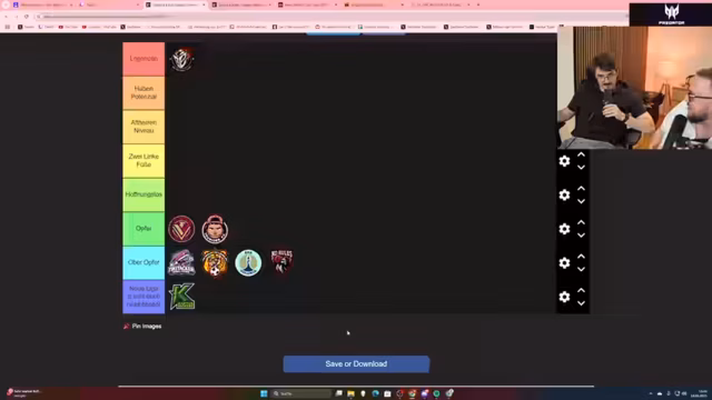 01:14:22Der Streamer und Wieland erstellen ein humorvolles Ranking aller acht Teams der Kings League. Sie verwenden ironische Kategorien wie 'Legenden', 'Altherrenniveau' und vor allem 'Opfer', in die die meisten Teams eingestuft werden. Teams wie die Tiki-Takas, Era Colonia und die Kaktusficker werden als klare 'Opfer' identifiziert. Ziel des Rankings ist es, einen möglichst spaltenden und unterhaltsamen Content für soziale Medien zu erstellen.