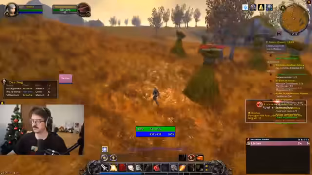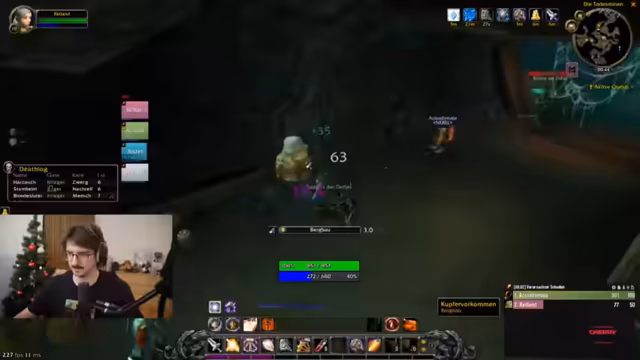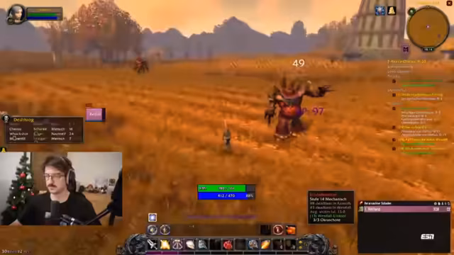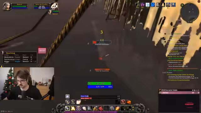 11:44:32Der Durchlauf des 'Deadmines' Dungeon beginnt mit hoher Aktivität. Der Streamer muss während des Kampfes gleichzeitig heilen, agieren und mit seiner überforderten Tastaturbelegung zurechtkommen. Die Gruppe erleidet einige kritische Momente, insbesondere durch den unkontrollierten Pull des Tanks, und der Streamer zeigt vermehrt Panik. Gleichzeitig ist er von den Aktionen des erfahrenen Tanks beeindruckt und freut sich über jeden erbeuteten Gegenstand.