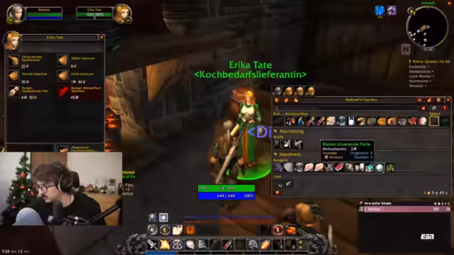 05:50:40Bei Level 16 wird über die Skillung des Paladins gesprochen. Es wird entschieden, die ersten Punkte in den Heiligbaum zu stecken, bis die Fähigkeit 'Weihe' verfügbar ist, der Rest geht in 'Vergeltung'. Ein Inventarproblem wird angesprochen, da der Platz knapp wird. Der Spieler sortiert und verkauft überflüssige Gegenstände wie Eberrippchen und Leber, um Platz zu schaffen, und kocht mit erhaltenen Rezepten wie 'Bojotensteak'.