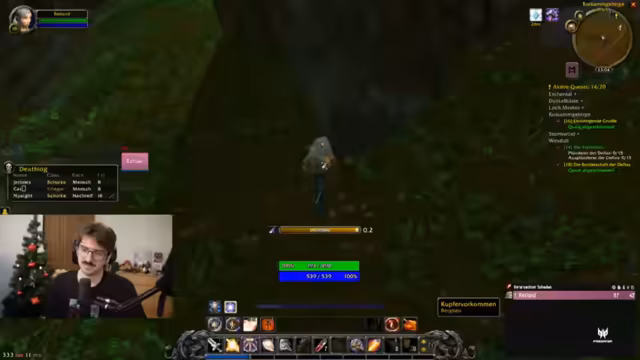 08:20:08Zu Beginn des Zeitraums konzentriert sich der Streamer auf das Leveln und das Erledigen von Quests. Er erkundet eine Patrouille, tötet Gegner, sammelt Schließkasten und questet durch verschiedene Gebiete. Dabei erwähnt er, dass er mit Level 18 oder 19 in die Todesminen gehen möchte, nachdem er das aktuelle Gebiet abschließt. Die Leveling-Erfahrung mit seinem Paladin wird als besonders entspannt und effektiv beschrieben, mit einem hohen Zuschauerpeak von 3000, was er als Höhepunkt des Streams bezeichnet.