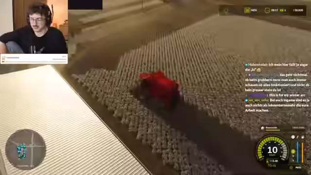 05:30:20Es wird über den Kauf eines Iseki-Geräts gesprochen, das bereits vorhanden ist, aber aufgrund von Krankheit verpasst wurde. Die bevorstehende Zuckerrübenernte wird geplant, einschließlich des Krautentfernens. Es wird beschlossen, die benötigten Geräte zunächst zu leihen, was hohe Kosten verursacht, aber auch hohe Einnahmen verspricht. Der Roder soll alle Aufgaben erledigen können. Drei Geräte werden für die drei Spieler geliehen, was zu Gesamtkosten von 106.000 führt. Die gemieteten Geräte werden als Panzer bezeichnet. Es wird die Frage aufgeworfen, wann der Hänger voll sein wird und ob er vorne angebracht werden muss. Es wird festgestellt, dass die Reichweite ähnlich gering ist wie bei anderen Geräten. Ein Spieler schläft während der Arbeit ein, was zu Problemen führt. Es stellt sich heraus, dass die andere Person auf der falschen Seite arbeitet. Es wird beschlossen, die KI auf Feld 2 einzusetzen, da der Panzer gemietet wurde. Ein Fehler beim Ausklappen des Schneidwerks wird festgestellt. Ein Anruf von Schiffschrubbel während des Streams führt zu einer kurzen Quizshow-Einlage, die jedoch scheitert. Der Streamer fühlt sich dabei hereingelegt. Als Reaktion darauf wird angekündigt, Schiffschrubbel in League of Legends zu snipen.