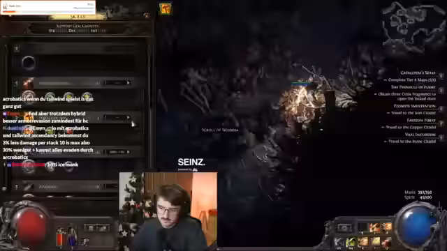 09:38:18Der Streamer beschäftigt sich intensiv mit den Schwierigkeiten des Nahkampfes in Path of Exile. Er erlebt ständig den Tod, da er von Gegnern eingekesselt wird und deren Angriffe nicht parieren kann, was ihn frustriert. Die Motivation ist jedoch vorhanden, da er von der späteren Stärke von Builds wie Flicker Strike träumt, bei dem er mit einem Klick ganze Gruppen von Gegnern eliminieren kann. Er stellt seine Build-Entscheidungen infrage und analysiert, welche Ausrüstung und Fähigkeiten für den aktuellen Level passend wären.