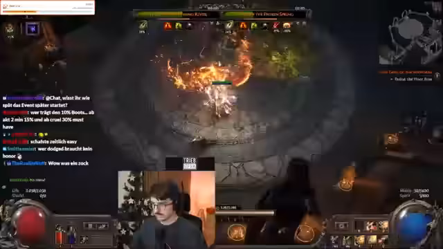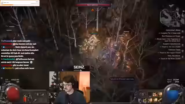 05:02:00Im Path of Exile-Teil des Streams geht es intensiv um einen explosionsbasierten Build. Der Streamer experimentiert mit Items, die Monster explodieren lassen, und beschreibt die beeindruckenden visuellen Effekte, die wie ein orbitaler Laser aussehen. Er erwähnt Probleme mit einem Support-Gem, dessen Mana-Kosten nicht wie beschrieben funktionieren, und vergleicht die beiden Tendencies Jamming und Burning Ground. Die Explosions-Mechanik scheint den meisten Spaß zu machen, auch wenn der Streamer anmerkt, dass seine Ausrüstung 'leckt', was wahrscheinlich Performance-Probleme bedeutet.