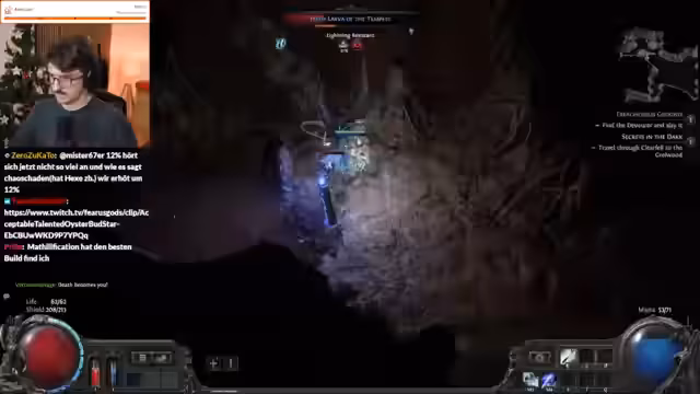 02:24:17Während des Spielens in Path of Exile erreicht der Streamer höhere Kartenebenen wie Tier 11 und stellt fest, dass der Schaden zunimmt und das Spiel anspruchsvoller wird. Er kämpft mit seinen defensiven Werten, ist 'squishy' und stirbt mehrfach, woraufhin er seine Fähigkeiten ('Iron Reflexes') und sein Equipment anpassen muss, um überleben zu können.