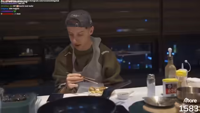 02:51:02Nach der Zubereitung wird gemeinsam das Bibimbap verzehrt. Hugo äußert, dass er sehr satt ist und ermutigt die anderen ebenfalls zu essen. Anschließend wechselt der Stream das Thema und es werden private Anekdoten ausgetauscht, darunter eine lustige Geschichte über Faki, der sich bei einem gemeinsamen Ausgang in Seoul stark betrinken musste. Hugo erwähnt auch einen Anruf bei seiner Mutter, den er aus alkoholisierter Führung getätigt hat.