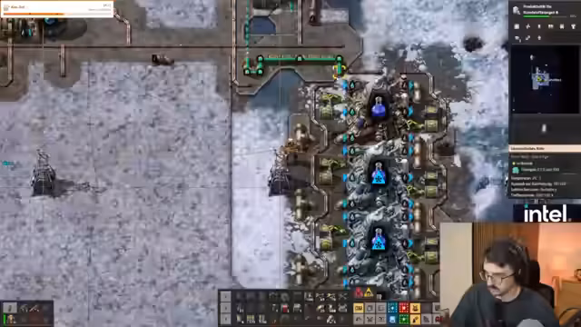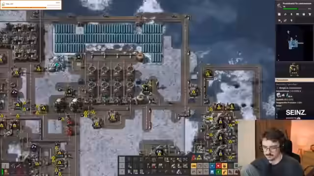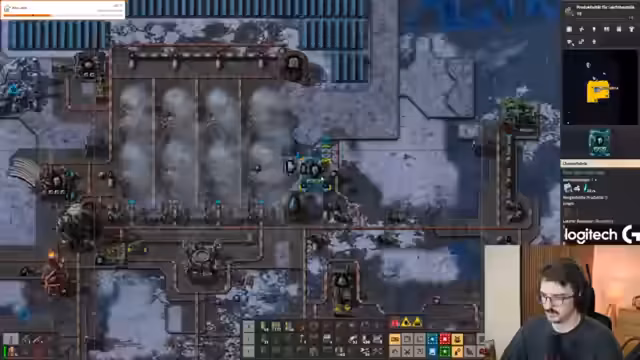 02:01:56Die Produktion von Festbrennstoff gestaltete sich als aufwendiger und platzintensiver als erwartet. Für die Herstellung werden Lithium, Fluorgas und Ammoniak benötigt, was eine komplexe Logik und viel Kühlleistung erfordert. Das initial falsche Einleiten von Fluorgas in das System führte zu Problemen und musste korrigiert werden. Die hohe Komplexität des Prozesses wurde mehrmals als nervig und krass bezeichnet.
