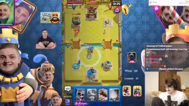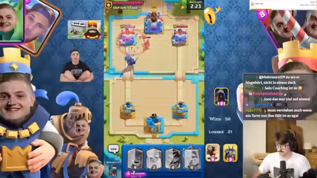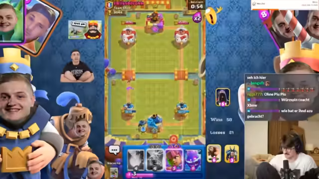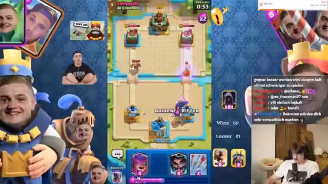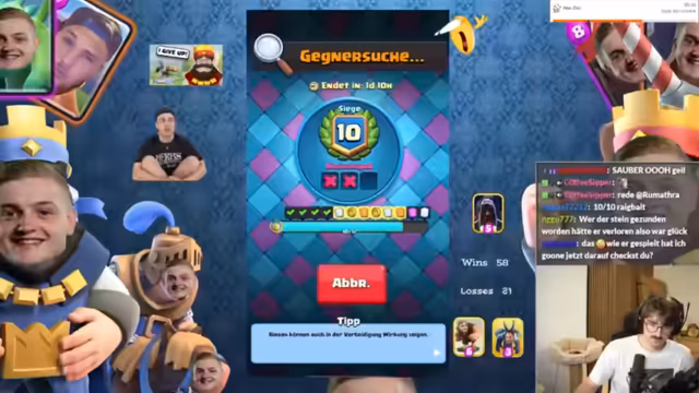 00:51:48Als Abwechslung zu Valorant wird Clash Royale gespielt. Das Ziel ist es, bis zum Eintreffen von Big Spin 8000 Trophäen zu erreichen. Der Streamer hat mit verschiedenen Decks wie Mortar und X-Bogen Erfolg, verliert aber auch einige Runden. Ein Gegner mit einem starken Mortar-Deck stellt ihn vor große Probleme. Trotzdem gelingt es ihm, einen Sieg zu erzielen und die 8000-Trophäen-Marke zu erreichen. Der Streamer fühlt sich motiviert und ist gespannt auf das bevorstehende Turnier.