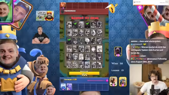 09:08:06Die Stream-Session konzentriert sich intensiv auf die Analyse von Spielen im Clan Battle. Der Fokus liegt auf taktischen Fehlern, insbesondere im Umgang mit Decks wie der Kanone und dem Lock. Der Streamer kritisiert wiederholte Fehler, wie das unvorteilhafte Platzieren von Einheiten, das Übercommit von Elixier und das Fehlen von defensivem Lock, was zu vermeidbaren Niederlagen führt. Es wird betont, dass das Spielverständnis und die mechanische Fähigkeit bei den Kontrahenten, die oft als Smurfs bezeichnet werden, deutlich höher sind, was den Druck erhöht.