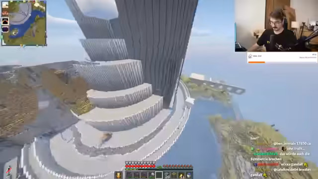 09:05:07Die Spieler diskutieren die Gestaltung der Türme neben dem Torhaus, insbesondere die Idee, kleinere Türme darauf zu setzen, da dies in vielen Modellen so dargestellt wird. Ein unerwartetes Ereignis tritt ein, als ein Ghast, der sich in der Basis befand, ertrinkt, was für Verwirrung sorgt. Es wird festgestellt, dass die Ressourcen, insbesondere Endeside, knapp werden, da sie schnell verbraucht werden. Die Spieler suchen nach weiteren Vorräten und finden Diorit in Bastis Kisten, was sie als gemeinsame Ressource betrachten. Es wird humorvoll vorgeschlagen, Bastis Namen durch Kevin zu ersetzen, um die Herkunft der Materialien zu verschleiern. Die Diskussion über die Gestaltung der Kreise und des Berges wird fortgesetzt, wobei unterschiedliche Meinungen über die Form und Größe der oberen Kreise geäußert werden, um ein authentisches Aussehen zu erzielen.
