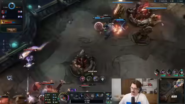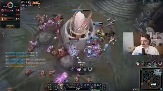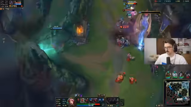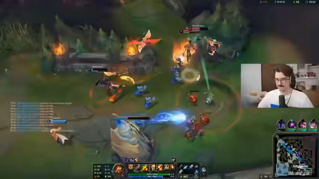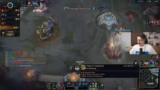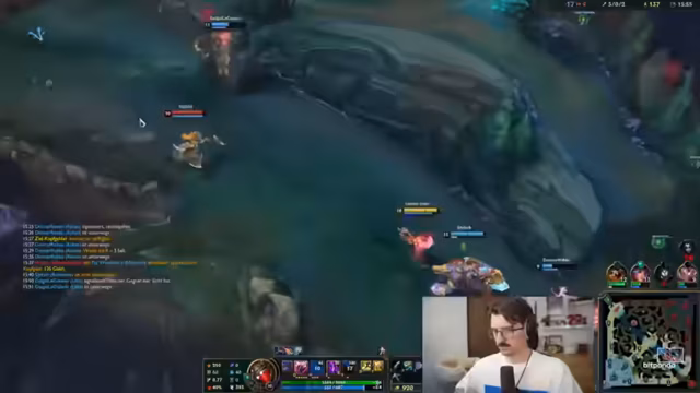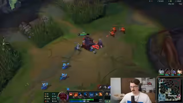 05:41:59Der Streamer beschreibt eine Phase, in der er sich vollkommen isoliert in der Mitte aufhält, während sein Team stattdessen um Drakes kämpft. Diese Trennung wird als fatal angesehen, da er somit alleine dem gegnerischen Druck ausgesetzt ist. Er gibt sich die Schuld an der Situation, da er nicht unter den Turm gehen wollte, aber er kritisiert vor allem den fehlenden Support durch den Maokai, der stattdessen nicht koordiniert handelt und wichtige Kämpfe verpasst.