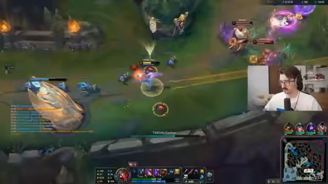 10:39:37Das Spiel beginnt mit einem sehr gierigen Play, bei dem der Streamer einen gefahrlosen Kampf für sich nutzt. Kurz darauf beschäftigt er sich mit der Top-Lane und bemerkt, dass die dortige Konstellation für seine Spielerfahrung gut funktioniert, da ein Champion mit neuen, ausprobierten Fähigkeiten zum Einsatz kommt. Der Streamer kommentiert das aggressive Vorgehen seiner Mitspieler und denkt über den Fortgang des Spiels nach, wobei er hofft, das Ranking verbessern zu können. Dabei kommt es zu einer kurzen Unterbrechung, bei der der Streamer technisch bedingt den Ton verliert und sich neu einwählen muss, was bei allen im Call zu Verwirrung führt.