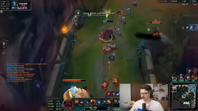 11:03:21Ein intensiver Teamfight in der Mid-Lane endet mit einem Triple Kill für das Team, was der Streamer als gelungen und spaßig bezeichnet. Nach dem Kampf beginnt eine Phase der Selbstreflexion über die Rolle der gespielten Samira. Der Streamer analysiert sein eigenes Spielverhalten und kommt zu dem Schluss, dass er die Champion nicht effizient einsetzt und sie für eine ernsthafte Spielweise nicht geeignet sei, was er auf seine ungewohnte Zusammenarbeit zurückführt. Parallel äußert er Unzufriedenheit mit seiner Kameraqualität und dem Stream-Link, der eine neue Anschaffung notwendig macht.